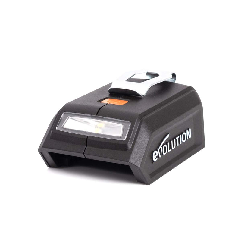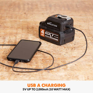 Recharge and power your digital devices anywhere with Evolution's new Cordless USB Battery Charger & LED light. Just clip this onto any Evolution or Erbauer 18v EXT Battery pack and you instantly have a reliable and powerful dual-port USB charger that can power and recharge USB A and USB-C devices simultaneously and has 30 Watt fast charge capability using USB-C.