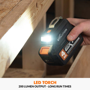 With a convenient built in LED light you'll always be able to see in the dark and get the most possible usage out of any Evolution EXT 2ah, 4Ah, 5Ah or 8Ah battery packs. Leave one in your bag and you'll always have a torch and a charger with you wherever you take your tools.