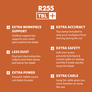 The R255TBL+ is safer. The more powerful 1,800w motor features Soft-Start, Electronic Blade Brake, motor overload protection and a paddle style emergency stop. The blade guard offers improved cut visibility, and the Quick Release Riving Knife design features offset angle and lateral adjustment for easier and safer cutting, especially when handling full size boards. The new motor housing offers improved dust extraction, better access for cleaning, and blade swaps are easier than ever before.