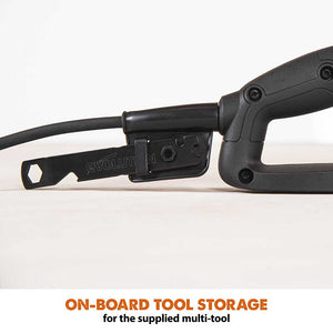 - On-board tool storage. One multi-tool for all machine adjustments with dedicated onboard storage.