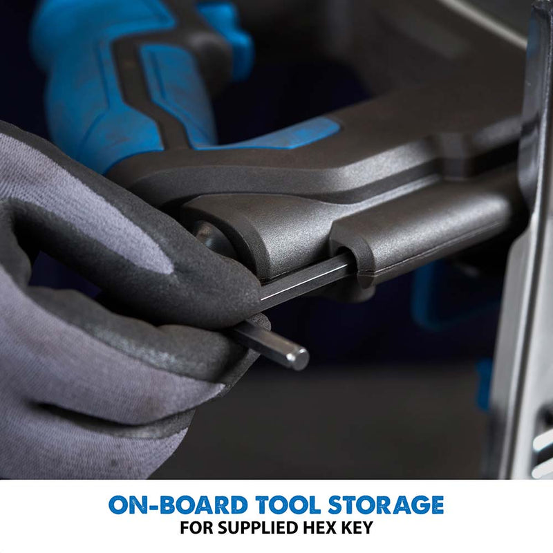 Designed to run clean the S210CCS Metal Cutting Circular Saw picks up it’s own metal chips and cleverly stores them in the high-capacity onboard magnetic chip collector. (60% larger than the EVOSAW230 chip collector). The chip collector features a simple quick-release latch making metal waste disposal a breeze and allowing easy access to the blade for simple and quick blade swaps.